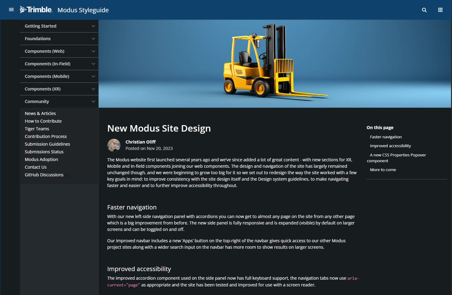 The Modus website first launched several years ago and we’ve since added a lot of great content - with new sections for XR, Mobile and In-field components joining our web components. The design and navigation of the site has largely remained unchanged though, and we were beginning to grow too big for it so we set out to redesign the way the site worked with a few key goals in mind: to improve consistency with the site design itself and the Design system guidelines, to make navigating faster and easier and to further improve accessibility throughout.